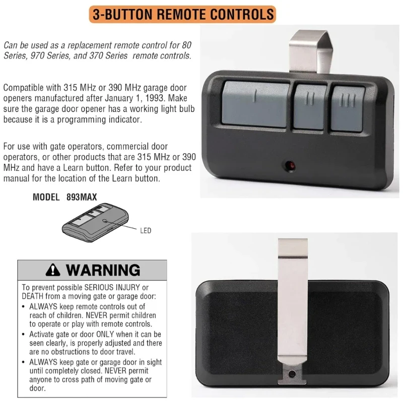 - 893LM security+ three-button remote control is a multi-function remote used to control garage door openers, gate operators, or For MyQ enabled light accessories. This unit gives you the ability to open 3 separate doors or gates, or a combination of 3 doors, gates, or lighting units. This garage door remote gives you a simple way to open and shut your garage door wirelessly and automatically. It's easy to code because there are only 3 buttons to choose from, making it user-friendly. It comes equipped with a visor clip that attaches to your vehicle's visor for easy access. It is also equipped with multi-frequency Security+ 2.0 rolling code technology that eliminates radio wave interference. This makes it virtually impossible for anyone to steal your remote control signal, and it also issues a new code every time you use it. A long-life 3V lithium battery is included for your convenience. The battery life for this remote is an average of 5 years due to its low 3V voltage.