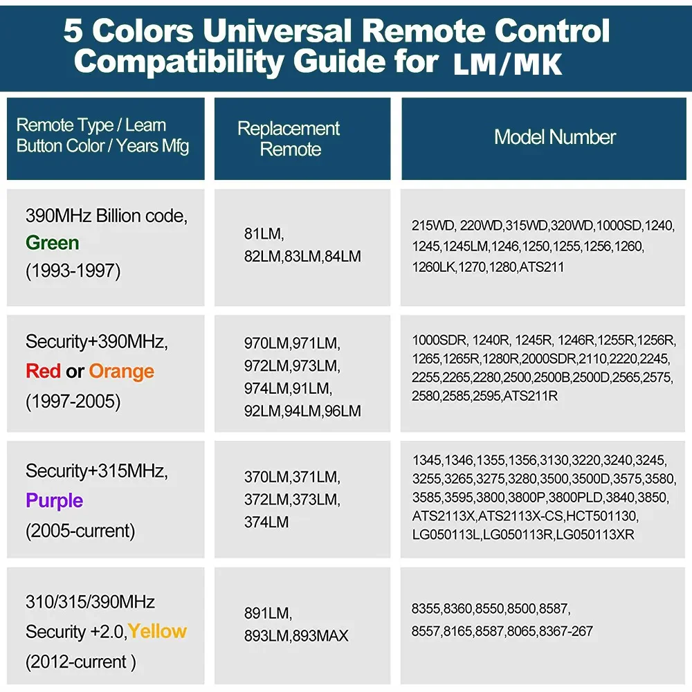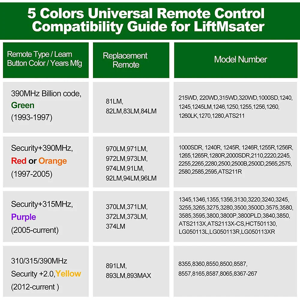 - 🚗 Universal – Works for LiftMaster, Chamberlain and Craftsman garage door openers manufactured from 1993 to current; Compatible for 3 different frequencies of security rolling code, it’s the easy option for adding an extra remote to multi-car families or for replacing lost or broken remotes.